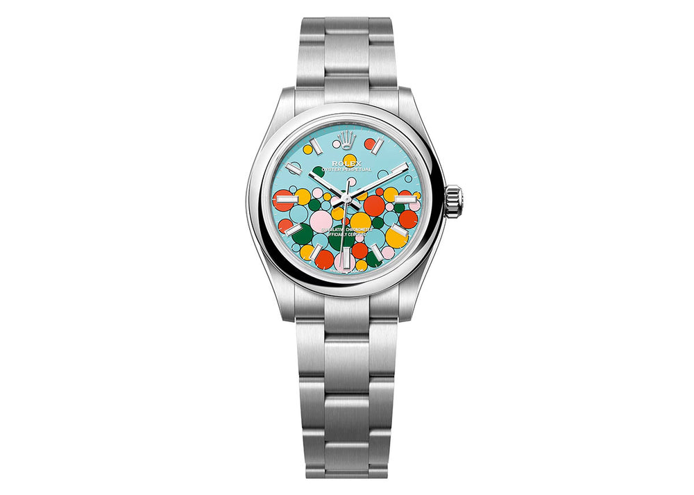 The Oyster Perpetual 31 with a turquoise blue, Celebration-motif dial and an Oyster bracelet.