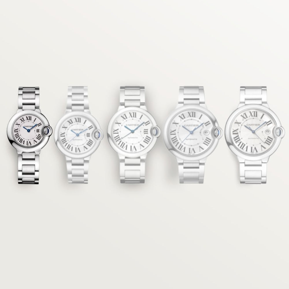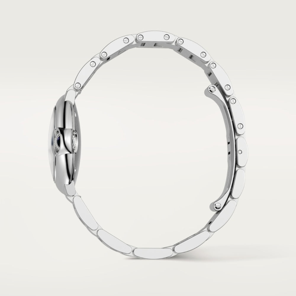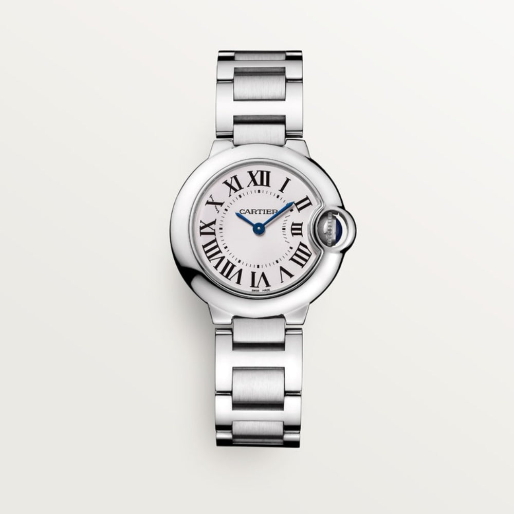 Ballon Bleu de Cartier watch, 28 mm, Quartz movement, Steel case, Fluted crown set with a synthetic cabochon-shaped spinel, Silvered opaline dial, Roman numerals, Blued-steel sword-shaped hands, Sapphire crystal, Interchangeable steel bracelet, Case dimensions: diameter: 1.1”, Thickness: 0.34”, Water-resistant up to 3 bar (approx. 30 meters/100 feet)