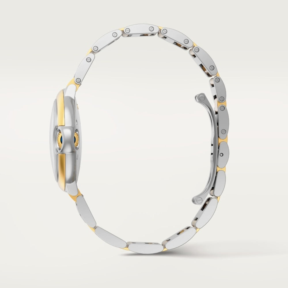 Ballon Bleu de Cartier watch, 33 mm, Mechanical movement with automatic winding, Steel case, Fluted 18K yellow gold (750/1000) crown set with a synthetic cabochon-shaped spinel, Silvered guilloché dial, Blued-steel sword-shaped hands, Sapphire crystal, Interchangeable two-tone strap, Thickness: 10.16 mm, Water-resistant up to 3 bar (approx. 30 meters/100 feet)