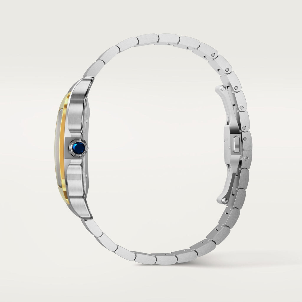 Santos de Cartier watch, large model, mechanical movement with automatic winding caliber 1847 MC. Steel case, bezel in yellow gold (750/1000), 7-sided crown set with a faceted synthetic blue spinel, anthracite gray dial with satin-finish gradation, sword-shaped hands in polished gold-plated steel, sapphire crystal. Steel with "SmartLink" adjustment system. Second strap in gray alligator leather, with interchangeable steel folding buckle. Boths are fitted with the "QuickSwitch" interchangeability system. Case width: 39.8 mm, thickness: 9.38 mm. Water-resistant to 10 bar (approx. 100 meters).
