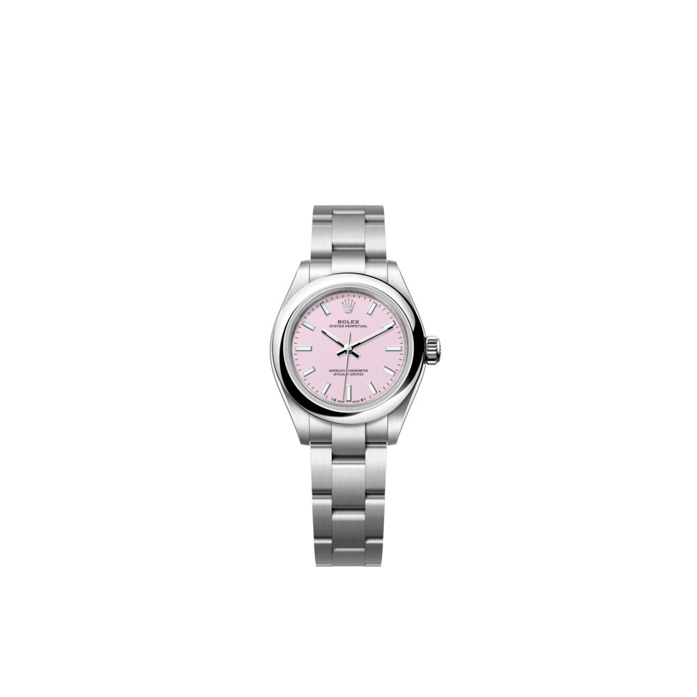 The Oyster Perpetual 28with a candy pinkdial and an Oysterbracelet.