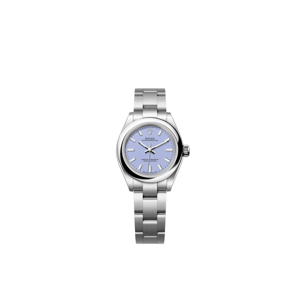 The Oyster Perpetual 28with a lavenderdial and an Oysterbracelet.