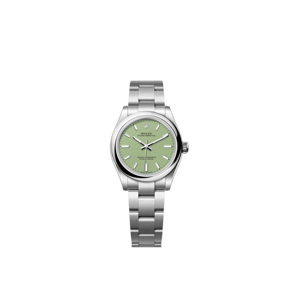 The Oyster Perpetual 31with a pistachiodial and an Oysterbracelet.
