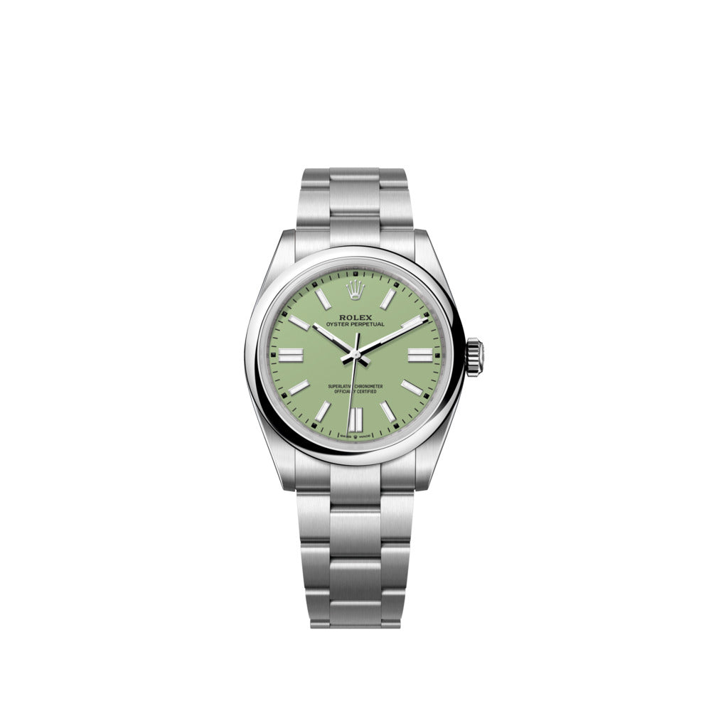 The Oyster Perpetual 41with a pistachiodial and an Oysterbracelet.